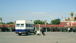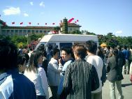 [Minh Huệ] Vào trưa ngày 1 tháng 10 năm 2004 (lễ Quốc khánh Trung quốc), rất nhiều du khách và thường dân đã chứng kiến cảnh công an Trung quốc đánh đập dã man và kéo lôi một đệ tử Pháp Luân Công. Những người có mặt tại quảng trường chỉ trích về hành động đó “Hôm nay, chúng tôi chính mắt thấy sự dã man của công an đối với Pháp Luân Công”.