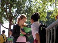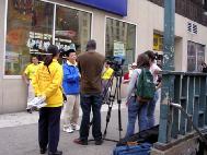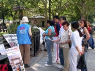 Một số người hỏi: “Tại sao các đệ tử lại đến đây để cho mọi người biết về điều này?”. Các đệ tử nói là những tin tức này bị chính phủ Trung quốc ngăn cấm không cho phổ biến để che đậy sự thật, và để lừa dối với mọi người về Pháp Luân Công, vì thế mọi người trên thế giới không biết sự thật về Pháp Luân Công và chính sách khủng bố Pháp Luân Công của chính quyền Trung quốc. Vì thế, các đệ tử đến Nữu ước để giảng rõ sự thật và cảnh tỉnh mọi người bằng công sức, tiến bạc của họ.