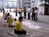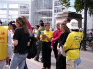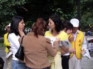 Chỉ vào những tấm hình đang trưng bày, một nhóm phụ nữ hỏi “Các bạn tìm mấy tấm hình này ở đâu?” Sau khi biết được những tấm hình đó gởi ra từ Trung quốc bởi các đệ tử Pháp Luân Công và họ đã liều mạng làm như thế, nhóm phụ nữ rất cảm động và nhận những tài liệu từ các đệ tử.