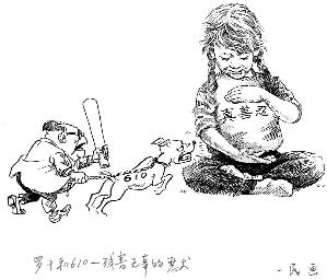 Giang Trạch Dân phát động chính sách khủng bố, thả chó ra. Giòng chữ trong tranh nói “Luo Gan và Phòng 610 — những con chó dữ giết hại dân lành vô tội”