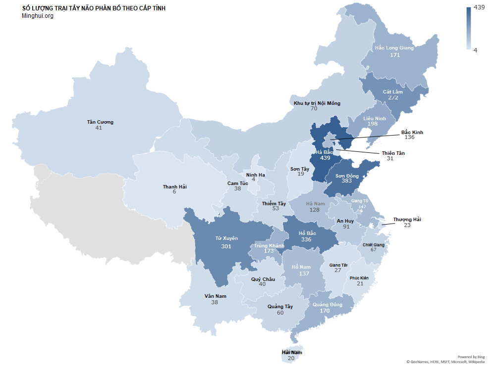 Số trung tâm tẩy não theo tỉnh (Nguồn: Minghui.org)