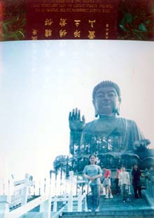 Ảnh chụp học viên Pháp Luân Đại Pháp trong khung cảnh bức tượng Phật rất lớn tại Đại Dữ Sơn, Hồng Kông. Trong ảnh có hình tấm bia và cảnh không gian khác nằm sau bức hình. Tấm bia này có vị trí phía sau bức tượng khoảng 30m, nhưng đã xuất hiện trong ảnh như là được đặt ngược trong không trung. Học viên này hiện nay đang ở tại Trung Quốc.