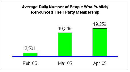 Từ ngày 4 tháng 12 năm 2004 đến ngày 7 tháng 4 năm 2005, có 710.000 người đã công bố thoát rời Đảng Cộng sản trung quốc cũng như những tổ chứ khác của Trung Cộng (ĐCSTQ). Số người thoát rời đã tăng lên nhanh chóng. Từ tháng 2 năm 2005 cho đến hiện nay, theo hàng tháng tính toán, trung bình hàng ngày có 2501, 16348 và 19259 người công bố “nghiêm chính thanh minh”. Dựa vào những dử liệu trên, quần chúng đã thấy rõ bản tính hung ác của Đảng Cộng sản. suy xét đến sự phong toả mạng lưới (Internet), và không khí căng thẳng, nỗi khiếp sợ Đảng cộng sản đã tạo ra, không dễ dự đoán được. Số người đã nhận thức rõ ràng bản chất của tà đảng, có ý thoát rời và sẽ thoát rời, rất có thể nhiều hơn 710.000 người. Sự thật là, lúc bức hại Pháp Luân Công, kẻ bức hại đã bộ lộ tính hung ác của họ, moị người đêù biết rõ. Sau khi chịu đựng sự bức hại tàn bạo, người tu luyện càng biết giá trị quý báu của Đại Pháp, mà càng kiên quyết tu luyện “Chân, Thiện, Nhẫn”. Nhưng cũng có nhiều người tu luyện bị ĐCSTQ lừa gạt, nhưng nhận thức rõ tà ác, chinh phục nỗi khiếp sợ trong nội tâm mà thoát rời ĐCSTQ, do dó tránh khỏi định mệnh bị thần tiêu diệt.