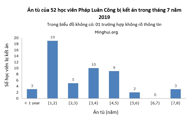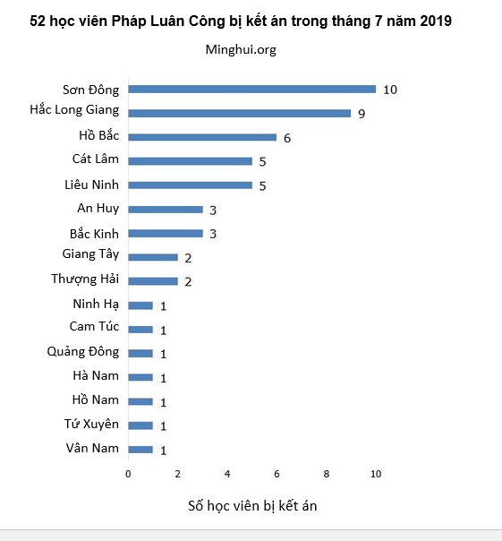 [MINH HUỆ 18-08-2019] Theo thông tin do Minh Huệ Net tổng hợp, tháng 7 năm 2019 ghi nhận 52 trường hợp học viên Pháp Luân Công bị kết án tù bởi hệ thống tòa án của Đảng Cộng sản Trung Quốc (ĐCSTQ).