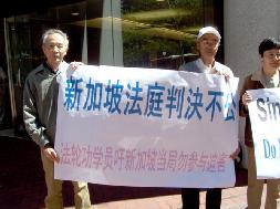Thỉnh nguyện bên ngoài Lãnh sự quán Singapore và kêu gọi chính quyền Singapore không tham gia cuộc bức hại. Biểu ngữ: Đừng trở thành kẻ đồng loã với Trung Cộng trong cuộc bức hại Pháp Luân Công