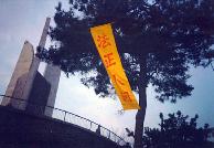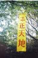 Các băng vải Pháp Chính Thiên Địa, Thiện Ác Tất Báo, Pháp Luân Đại Pháp Hảo tại điểm du lịch núi Nghi Mông
