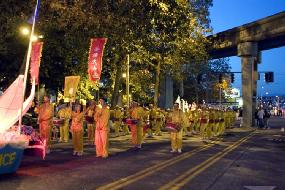 Ngay đắng sau “ Con thuyền”, là đoàn học viên múa trống. Nhiều trẻ em đã vỗ tay cùng nhịp trống. và nhanh chóng vây quanh các học viên để chơi trống khi các học viên nghỉ giải lao. Đội trống trình diễn lặp lại nhiều lần cùng với bài hát “Pháp Luân Đại Pháp là tốt” và âm nhạc “hân hoan”. Sau đội trống là một nhóm học viên trình diễn những bài động tác. Sau nhóm học viên là biểu ngữ, “Chân-Thiện-Nhẫn.”