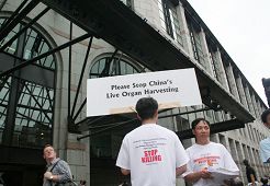 Trưng bày khẩu hiệu và tranh ảnh để phản đối việc mổ cắp các bộ phận nội tạng từ các đệ tử Pháp Luân Công vẫn đang còn sống của ĐCSTQ