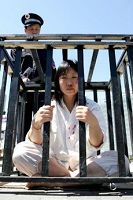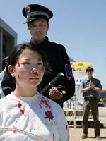 Vào ngày 18 tháng 7, 2006, các đệ tử Pháp Luân Công tổ chức một hoạt cảnh sự tra tấn của ĐCSTQ trước toà nhà Quốc hội Châu Âu để phản đối chính sách khủng bố Pháp Luân Công của ĐCSTQ (hình của Reuters)