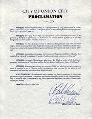 Xét vì, Pháp Luân Công (Pháp Luân Đại Pháp) là một môn khí công tự luyện có căn cội nơi văn hoá Trung Quốc cổ đại và lần đầu tiên được giới thiệu với dân chúng năm 1992, và được công nhận bởi Đô chính của Thành phố Union City ngày 5 tháng mười hai, 2000; và