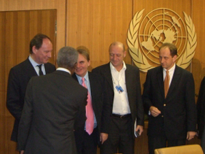 Phó chủ tịch Quốc hội Châu Âu Edward McMillan-Scott (trái) yêu cầu Tổng thư ký Kofi Anna (quay lưng) tìm cách phóng thích hai tù nhân lương tâm Trung Quốc (Đại Kỷ Nguyên)