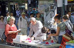 Người qua đường đang đọc các tờ bướm để biết về phong trào thoái Đảng Cộng sản Trung Quốc.