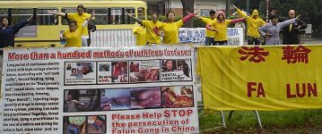 Các học viên Pháp Luân Công ngồi tịnh trên cỏ để nói lên sự phản đối của họ, và cũng trình bày các băng vải bằng tiếng Trung hoa, Pháp và Anh, viết: “Pháp Luân Đại Pháp, ” “Phản đối sự gặt hái nội tạng từ các học viên Pháp Luân Công còn sống vì lợi lộc của ĐCSTQ.” Họ trình bày các hình ảnh nói lên cuộc bức hại tàn bạo Pháp Luân Công của ĐCSTQ và một số báo cáo của các kênh thông tin về đó từ cộng đồng quốc tế. Các học viên Pháp Luân công lên án cuộc bức hại và tưởng niệm các đồng tu của họ tại Trung Quốc lục địa mà đã chết vì bị bức hại và vì kiên định trong đức tin của họ nơi Chân Thiện Nhẫn.”