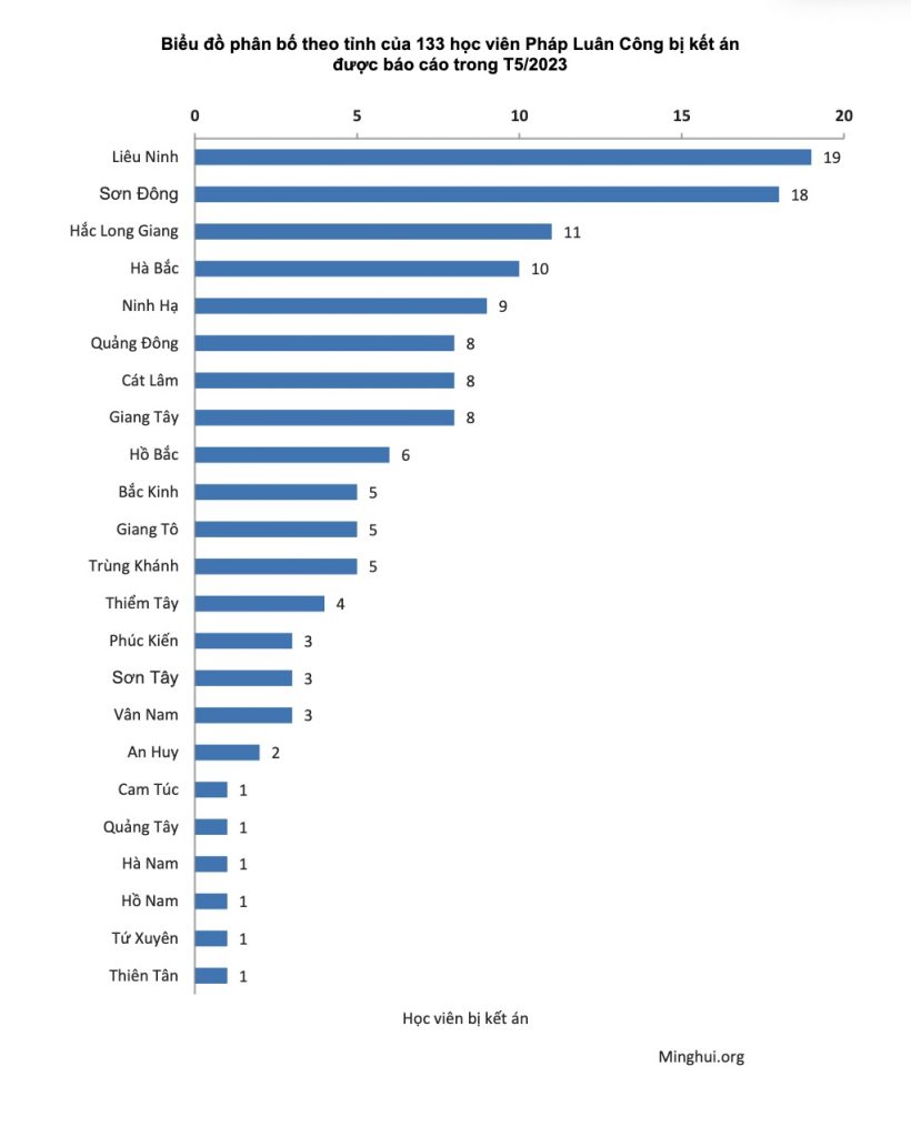 Các học viên bị kết án đến từ 23 tỉnh thành, thành phố trực thuộc trung ương và khu tự trị ở Trung Quốc. Liêu Ninh là tỉnh đứng đầu danh sách với 19 trường hợp, tiếp theo là Sơn Đông (18), Hắc Long Giang (11) và Hà Bắc (10). 19 khu vực còn lại báo cáo từ 1 đến 9 trường hợp kết án.