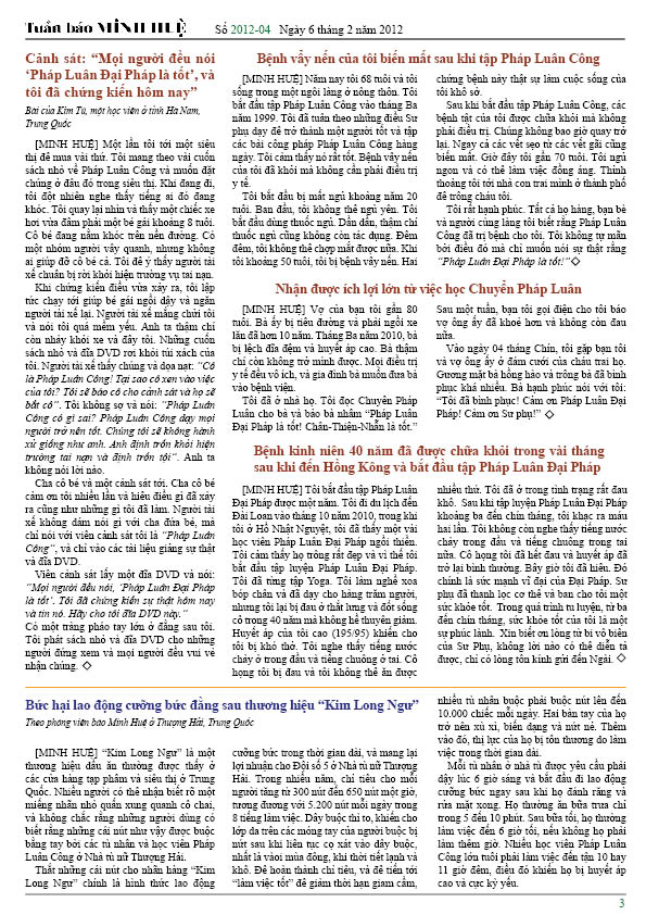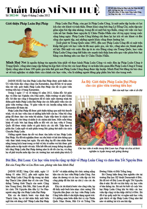 [MINH HUỆ 08-02-2012]Tuần báo Minh Huệ tổng hợp tin tức hàng tuần về cuộc đàn áp ở Trung Quốc và các sự kiện của học viên Pháp Luân Công trên khắp thế giới, với dạng thức là bản in màu định dạng PDF, gồm 4 trang. Bản PDF này định dạng khổ A4 tiện dụng cho việc in ấn phổ thông.
