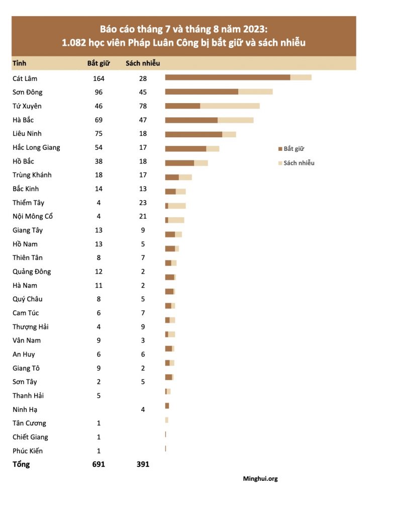 [MINH HUỆ 20-09-2023] Tổng cộng 1.082 học viên Pháp Luân Công bị bắt giữ hoặc sách nhiễu vì kiên định đức tin được báo cáo trong tháng 7 và tháng 8 năm 2023.