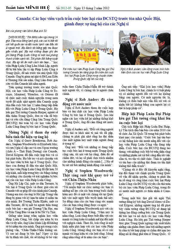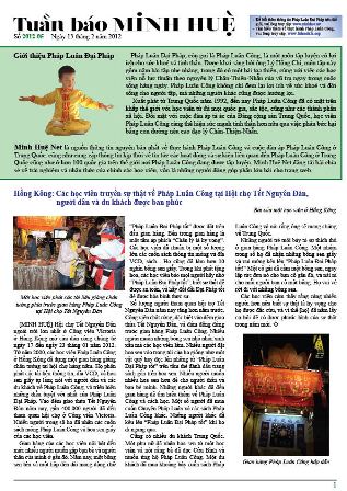 [MINH HUỆ 17-02-2012]Tuần báo Minh Huệ tổng hợp tin tức hàng tuần về cuộc đàn áp ở Trung Quốc và các sự kiện của học viên Pháp Luân Công trên khắp thế giới, với dạng thức là bản in màu định dạng PDF, gồm 4 trang. Bản PDF này định dạng khổ A4 tiện dụng cho việc in ấn phổ thông.