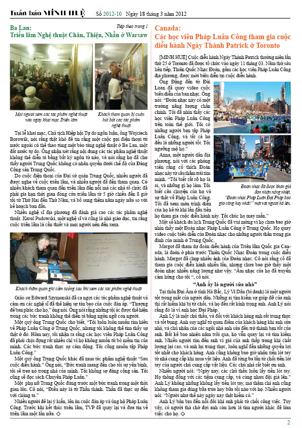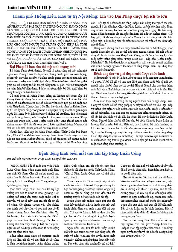 [MINH HUỆ 22-03-2012]Tuần báo Minh Huệ tổng hợp tin tức hàng tuần về cuộc đàn áp ở Trung Quốc và các sự kiện của học viên Pháp Luân Công trên khắp thế giới, với dạng thức là bản in màu định dạng PDF, gồm 4 trang. Bản PDF này định dạng khổ A4 tiện dụng cho việc in ấn phổ thông.