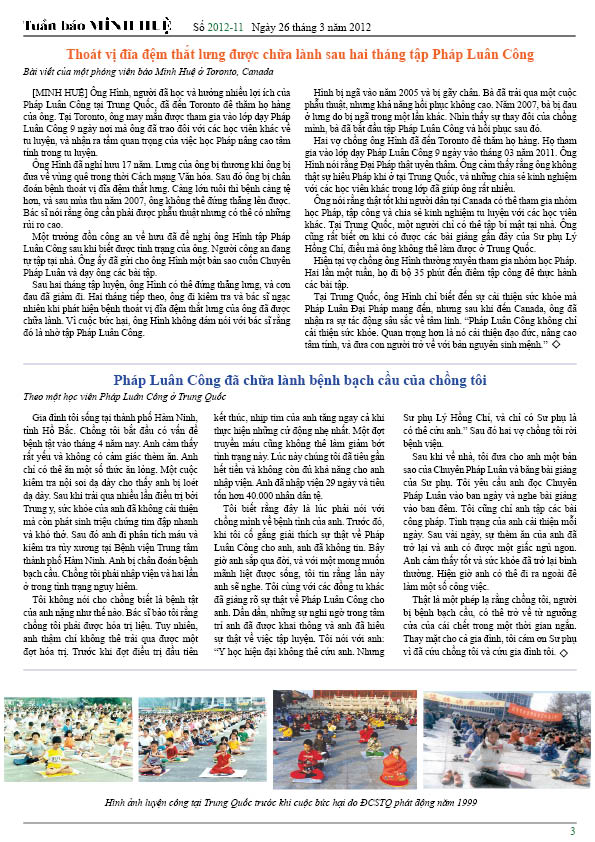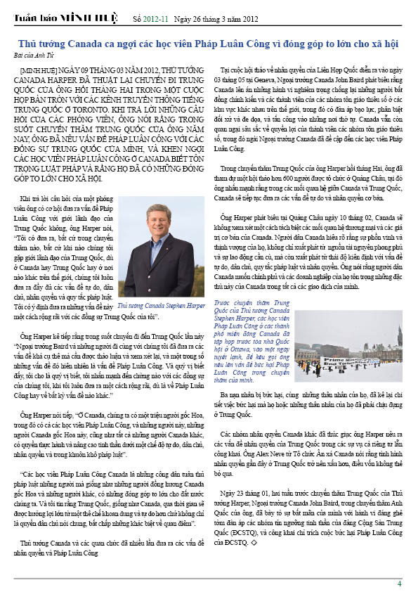 [MINH HUỆ 27-03-2012]Tuần báo Minh Huệ tổng hợp tin tức hàng tuần về cuộc đàn áp ở Trung Quốc và các sự kiện của học viên Pháp Luân Công trên khắp thế giới, với dạng thức là bản in màu định dạng PDF, gồm 4 trang. Bản PDF này định dạng khổ A4 tiện dụng cho việc in ấn phổ thông.