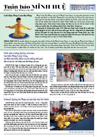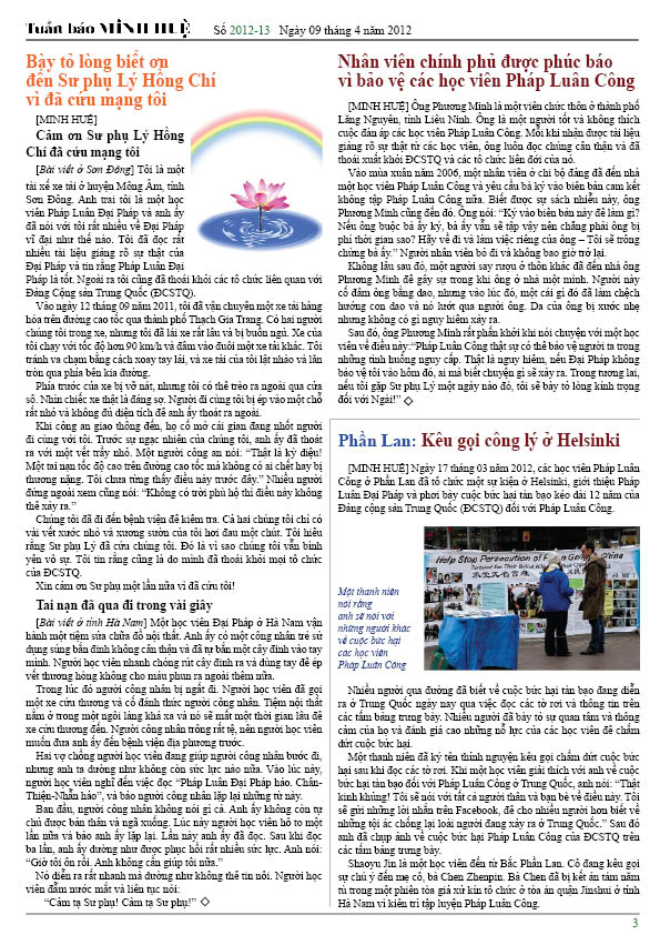 [MINH HUỆ 10-04-2012]Tuần báo Minh Huệ tổng hợp tin tức hàng tuần về cuộc đàn áp ở Trung Quốc và các sự kiện của học viên Pháp Luân Công trên khắp thế giới, với dạng thức là bản in màu định dạng PDF, gồm 4 trang. Bản PDF này định dạng khổ A4 tiện dụng cho việc in ấn phổ thông.