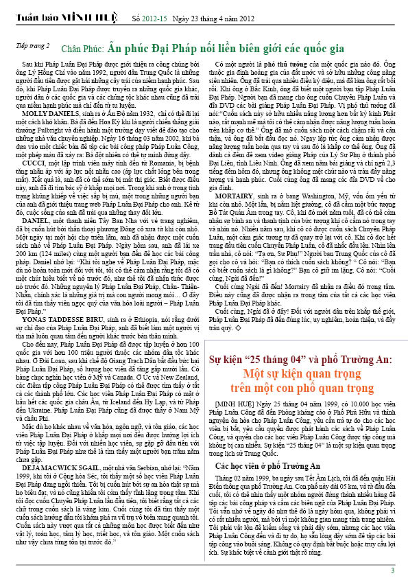 [MINH HUỆ 24-04-2012]Tuần báo Minh Huệ tổng hợp tin tức hàng tuần về cuộc đàn áp ở Trung Quốc và các sự kiện của học viên Pháp Luân Công trên khắp thế giới, với dạng thức là bản in màu định dạng PDF, gồm 4 trang. Bản PDF này định dạng khổ A4 tiện dụng cho việc in ấn phổ thông.