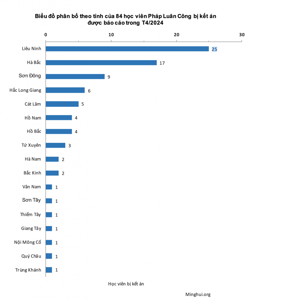84 học viên Pháp Luân Công bị kết án phân bố ở 15 tỉnh và 2 thành phố trực thuộc trung ương. Liêu Ninh và Hà Bắc đứng đầu, với lần lượt 25 và 17 trường hợp. 15 khu vực còn lại có từ 1 đến 9 trường hợp. Án tù của các học viên dao động từ 4 tháng đến 8 năm, trong đó 12 học viên nhận mức án từ 5 năm trở lên.