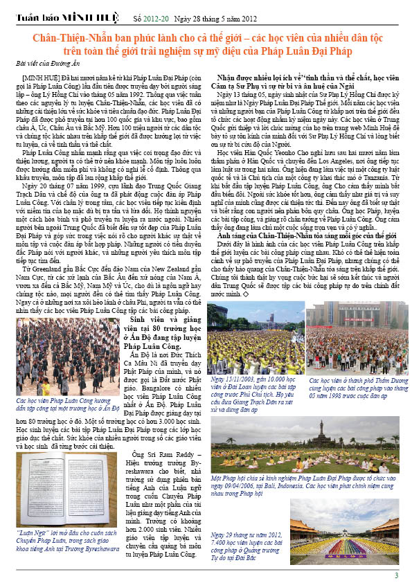[MINH HUỆ 28-05-2012]Tuần báo Minh Huệ tổng hợp tin tức hàng tuần về cuộc đàn áp ở Trung Quốc và các sự kiện của học viên Pháp Luân Công trên khắp thế giới, với dạng thức là bản in màu định dạng PDF, gồm 4 trang. Bản PDF này định dạng khổ A4 tiện dụng cho việc in ấn phổ thông.