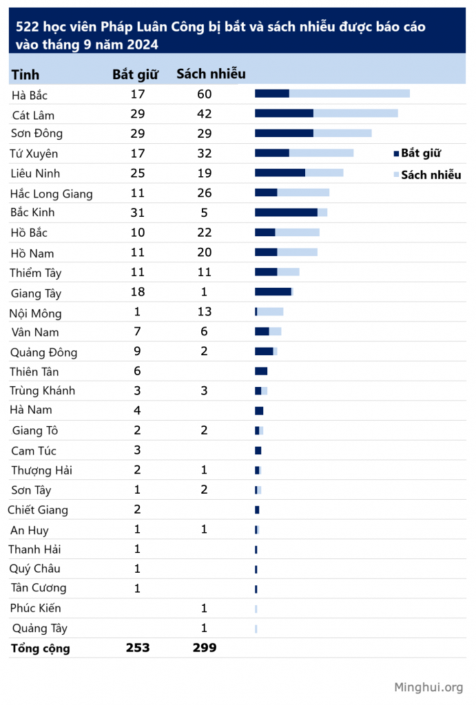 [MINH HUỆ 07-10-2024] Tháng 9 năm 2024 ghi nhận tổng cộng 522 trường hợp học viên Pháp Luân Công bị bắt giữ hoặc sách nhiễu, bao gồm 253 trường hợp bắt giữ và 299 trường hợp sách nhiễu.