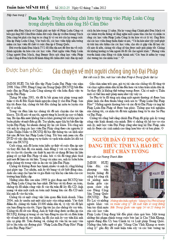 [MINH HUỆ 3-7-2012]Tuần báo Minh Huệ tổng hợp tin tức hàng tuần về cuộc đàn áp ở Trung Quốc và các sự kiện của học viên Pháp Luân Công trên khắp thế giới, với dạng thức là bản in màu định dạng PDF, gồm 4 trang. Bản PDF này định dạng khổ A4 tiện dụng cho việc in ấn phổ thông.