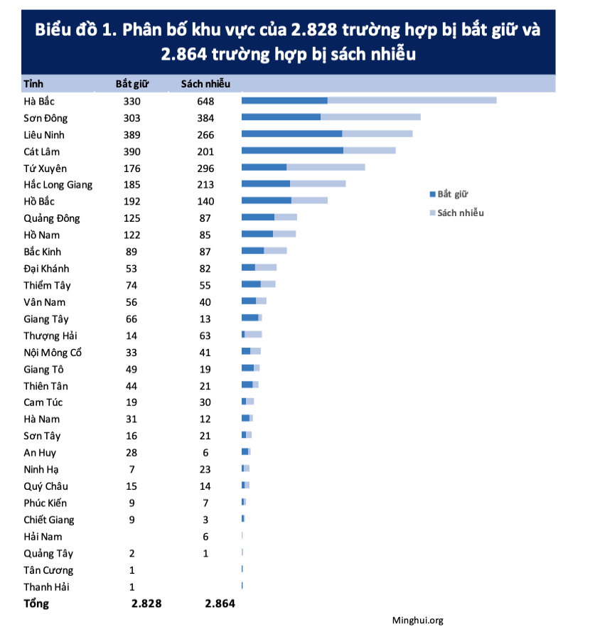 Trung Quốc có 22 tỉnh, 4 thành phố trực thuộc trung ương (Bắc Kinh, Thiên Tân, Thượng Hải và Trùng Khánh) và 5 khu tự trị (Quảng Tây, Nội Mông, Tây Tạng, Tân Cương và Ninh Hạ). Ngoại trừ Tây Tạng, tất cả 30 khu vực hành chính còn lại đều báo cáo các trường hợp bắt giữ và sách nhiễu vào năm 2024.
