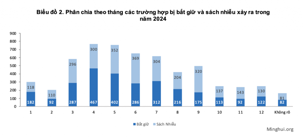 2.828 trường hợp bắt giữ và 2.864 trường hợp sách nhiễu được báo cáo đều xảy ra vào năm 2024. Ngoại trừ 82 vụ bắt giữ và 81 vụ sách nhiễu chưa rõ tháng, thì 5.529 trường hợp còn lại xảy ra trong suốt cả năm. Đặc biệt, việc bức hại từ tháng 3 đến tháng 9 nghiêm trọng hơn nhiều so với những tháng còn lại của năm, với trung bình 613 vụ bắt giữ và sách nhiễu mỗi tháng trong 7 tháng (tháng 3 – tháng 9) gần gấp 2,5 lần số vụ trung bình hàng tháng (248) trong 5 tháng còn lại (tháng 1, tháng 2, tháng 10, tháng 11 và tháng 12).