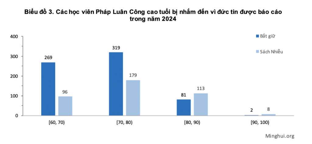 Trong số 5.692 học viên bị nhắm đến, có 1.067 người từ 60 tuổi trở lên, bao gồm 365 người ở độ tuổi 60, 498 người ở độ tuổi 70, 194 người ở độ tuổi 80 và 10 người ở độ tuổi 90. Học viên lớn tuổi nhất, bà Lưu Tâm Lan, 99 tuổi, ở thành phố Mai Châu, tỉnh Quảng Đông, bị sách nhiễu tại nhà vào ngày 31 tháng 3 năm 2024. Cảnh sát tịch thu một cuốn Chuyển Pháp Luân, cuốn sách chính của Pháp Luân Công.