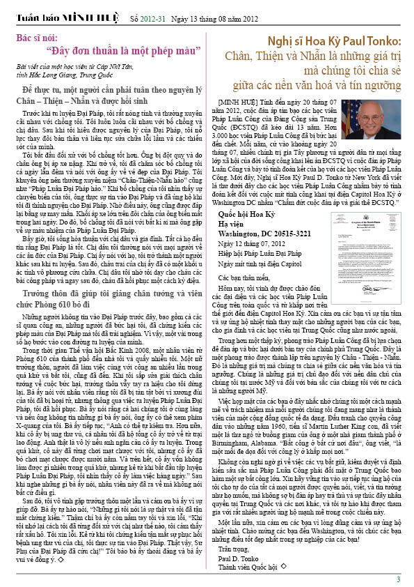 [MINH HUỆ 14-08-2012]Tuần báo Minh Huệ tổng hợp tin tức hàng tuần về cuộc đàn áp ở Trung Quốc và các sự kiện của học viên Pháp Luân Công trên khắp thế giới, với dạng thức là bản in màu định dạng PDF, gồm 4 trang. Bản PDF này định dạng khổ A4 tiện dụng cho việc in ấn phổ thông.