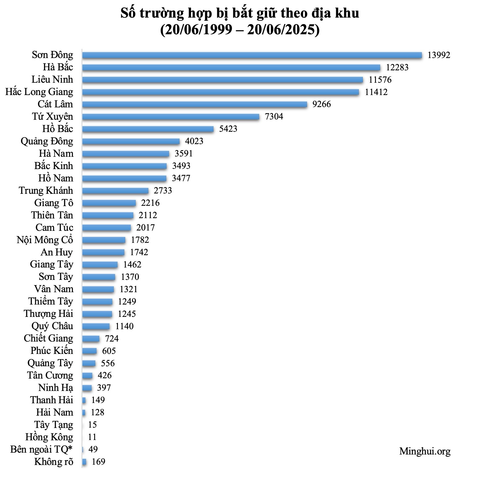 Ghi chú: Tổng số lượt học viên bị bắt cóc có đôi chút chênh lệch giữa số liệu phân bố theo năm và phân bố theo khu vực. Tương tự, dữ liệu từ năm 2016 trở về trước được lấy từ “Báo cáo Minh Huệ: Cuộc bức hại Pháp Luân Công của ĐCSTQ 25 năm qua” (Minghui Report: The CCP’s Persecution of Falun Gong: 25 Years and Counting), các số liệu sau đó được lấy từ các báo cáo thống kê của Minh Huệ (Minghui.org).