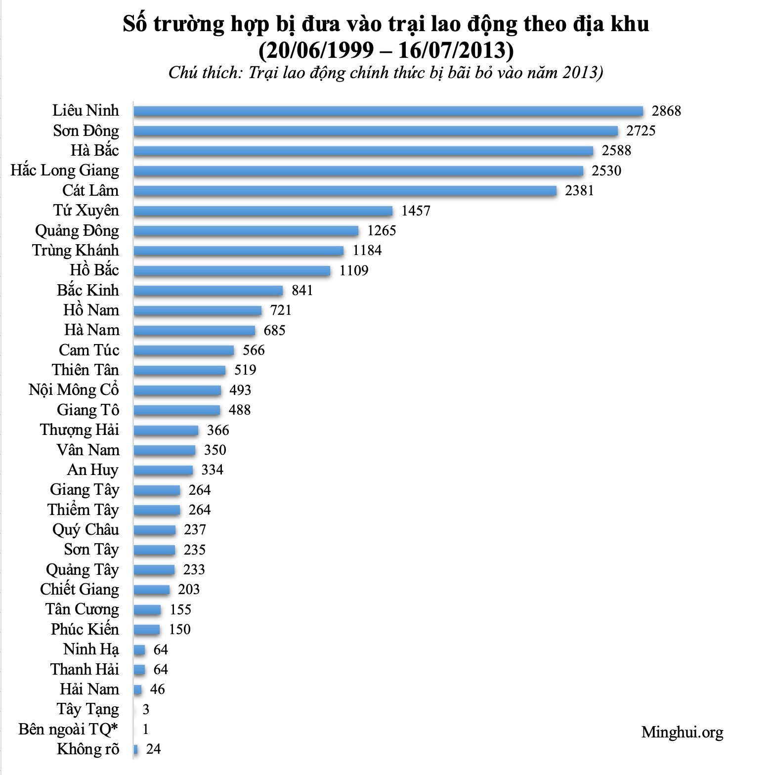 Ghi chú: Trại lao động cưỡng bức do ĐCSTQ du nhập vào Trung Quốc từ Liên Xô và được các cán bộ ĐCSTQ các nơi sử dụng rộng rãi nhất để bức hại Pháp Luân Công. Loại hình này đã chính thức bị giải thể vào năm 2013, do đó biểu đồ này kết thúc ở năm 2013)
