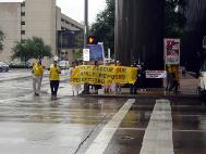Trong suốt buổi họp báo, hơn 300 đệ tử ở Mỹ, Gia nã đại, Úc, Ðức, Thụy sĩ, Ðài loan và các quốc gia khác đứng nghiêm trang phía sau người nói chuyện trong cơn mưa. Nhiều đệ tử mang theo những biểu ngữ như “Pháp Luân Ðại Pháp hảo”, “Ðộc tài Giang Trạch Dân: Chấm dứt Ðàn áp Pháp Luân Công”, “Làm ơn Giúp Cứu sống Thân Nhân của Tôi” cả hai ngôn ngữ: Anh và Hoa. Sau buổi họp báo, tất cả các đệ tử cùng nhau đi diễn hành xuống thành phố Houston trong cơn mưa. Cô Hong từ Nữu Uớc nói chuyện với các phóng viên sau buổi tuần hành “Rất là nhiều người ở đây đang gặp phải những khó khăn, nhưng tất cả họ đều muốn đến đây từ khắp nơi trên thế giới để nói lên tiếng nói công lý, để cho mọi người được hiểu rõ sự thật, và những thực tế đã xảy ra cho những đệ tử ở Trung quốc. Tất cả họ đều đứng yên lặng và đi tuần hành dưới những cơn mưa tầm tả trong một thời gian rất dài, nhưng không một ai than phiền điều gì cả. Những điều này thật sự gây cho tôi rất nhiều cảm động”.