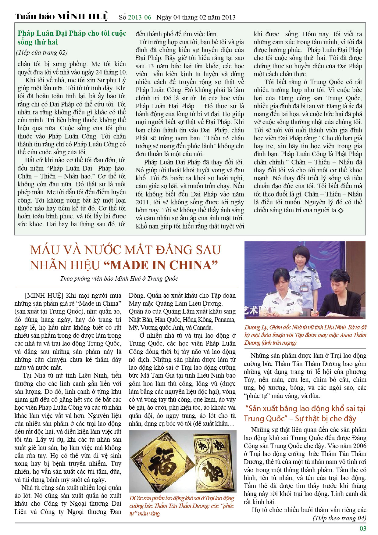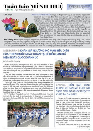 [MINH HUỆ 7-2-2013]Tuần báo Minh Huệ tổng hợp tin tức hàng tuần về cuộc đàn áp ở Trung Quốc và các sự kiện của học viên Pháp Luân Công trên khắp thế giới, với dạng thức là bản in màu định dạng PDF, gồm 4 trang. Bản PDF này định dạng khổ A4 tiện dụng cho việc in ấn phổ thông.