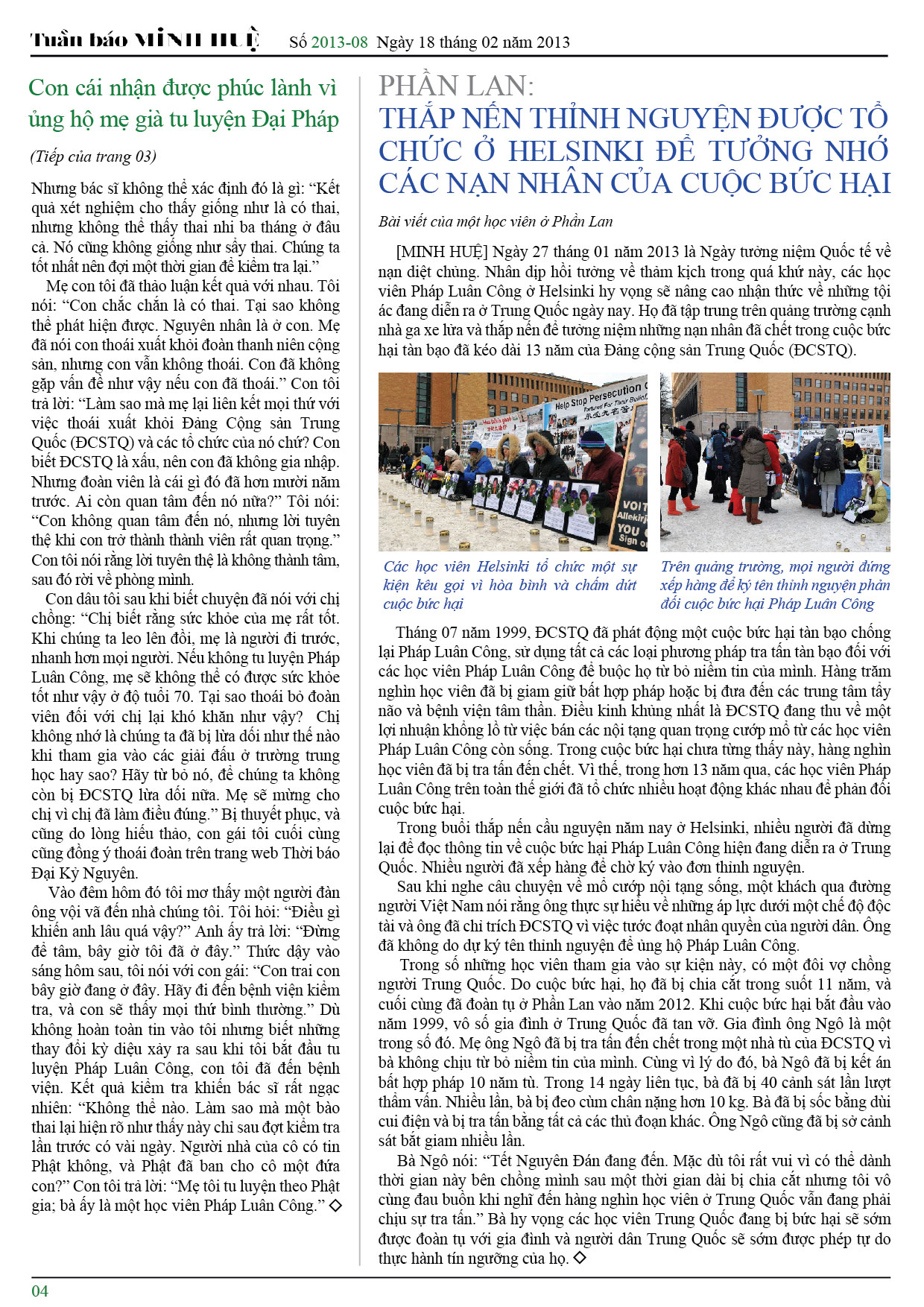 [MINH HUỆ 20-2-2013]Tuần báo Minh Huệ tổng hợp tin tức hàng tuần về cuộc đàn áp ở Trung Quốc và các sự kiện của học viên Pháp Luân Công trên khắp thế giới, với dạng thức là bản in màu định dạng PDF, gồm 4 trang. Bản PDF này định dạng khổ A4 tiện dụng cho việc in ấn phổ thông.