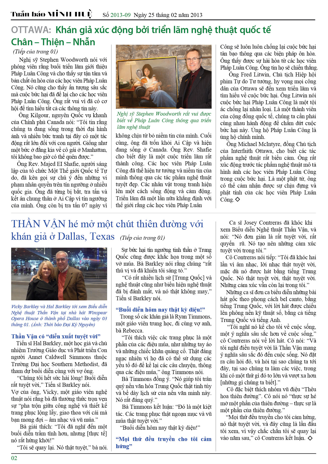 [MINH HUỆ 25-2-2013]Tuần báo Minh Huệ tổng hợp tin tức hàng tuần về cuộc đàn áp ở Trung Quốc và các sự kiện của học viên Pháp Luân Công trên khắp thế giới, với dạng thức là bản in màu định dạng PDF, gồm 4 trang. Bản PDF này định dạng khổ A4 tiện dụng cho việc in ấn phổ thông.