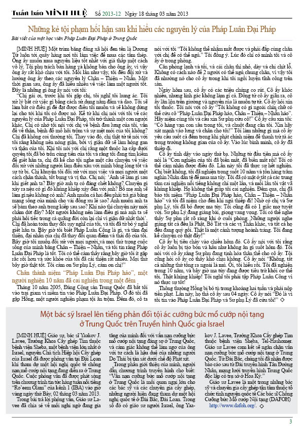 [MINH HUỆ 22-03-2013]Tuần báo Minh Huệ tổng hợp tin tức hàng tuần về cuộc đàn áp ở Trung Quốc và các sự kiện của học viên Pháp Luân Công trên khắp thế giới, với dạng thức là bản in màu định dạng PDF, gồm 4 trang. Bản PDF này định dạng khổ A4 tiện dụng cho việc in ấn phổ thông.