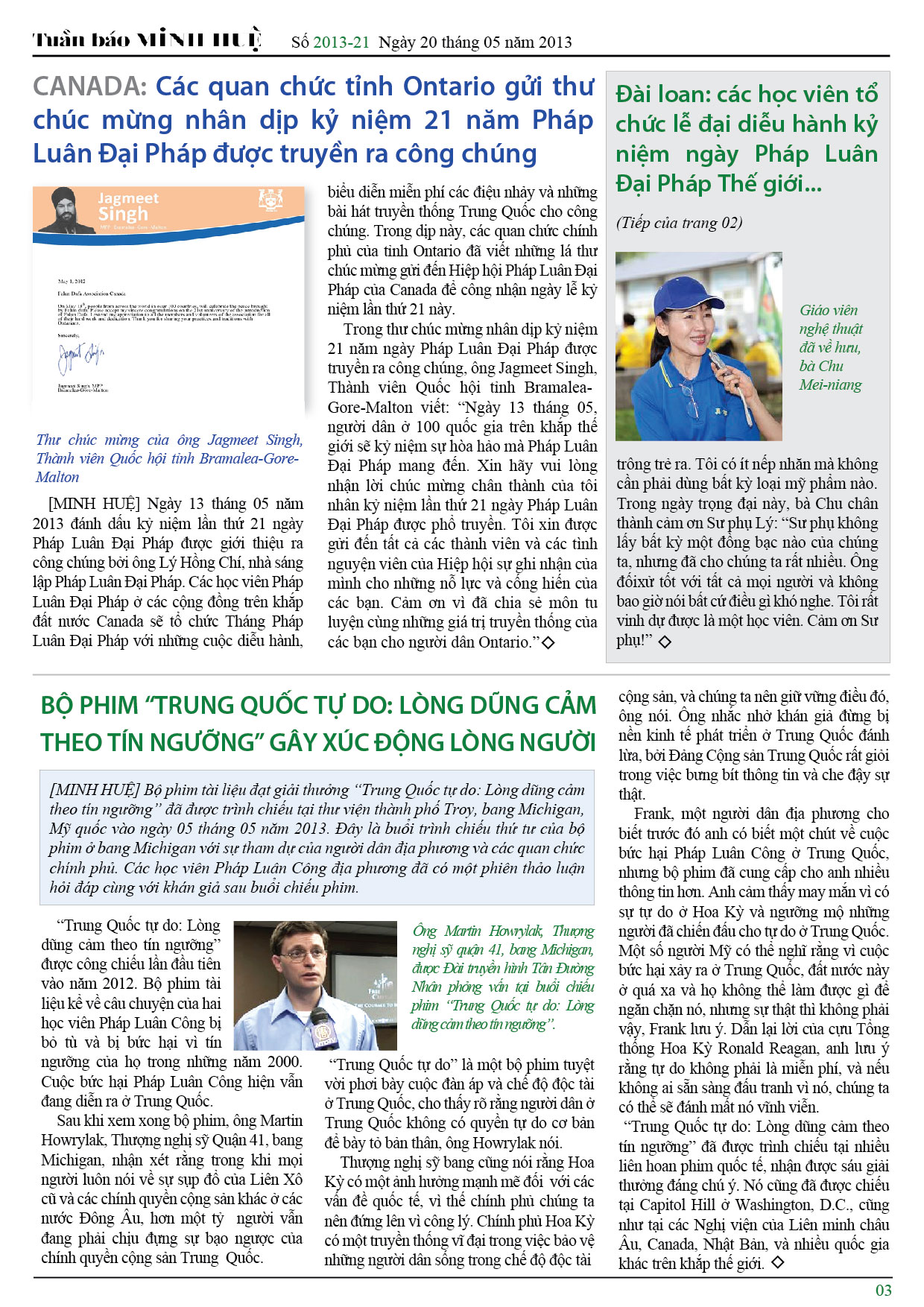 [MINH HUỆ 24-05-2013]Tuần báo Minh Huệ tổng hợp tin tức hàng tuần về cuộc đàn áp ở Trung Quốc và các sự kiện của học viên Pháp Luân Công trên khắp thế giới, với dạng thức là bản in màu định dạng PDF, gồm 4 trang. Bản PDF này định dạng khổ A4 tiện dụng cho việc in ấn phổ thông.