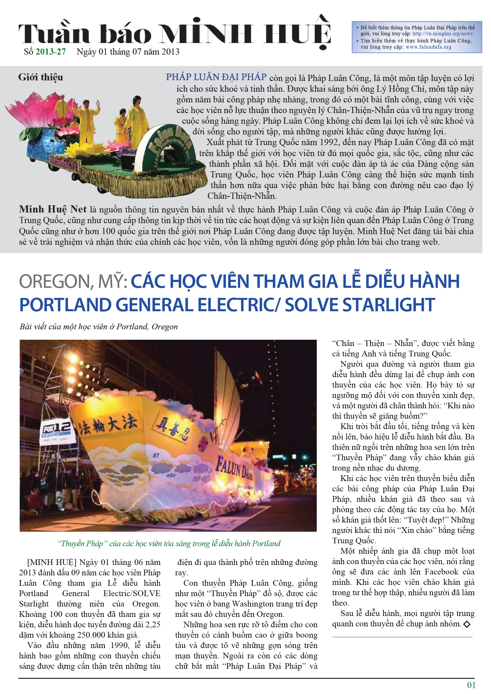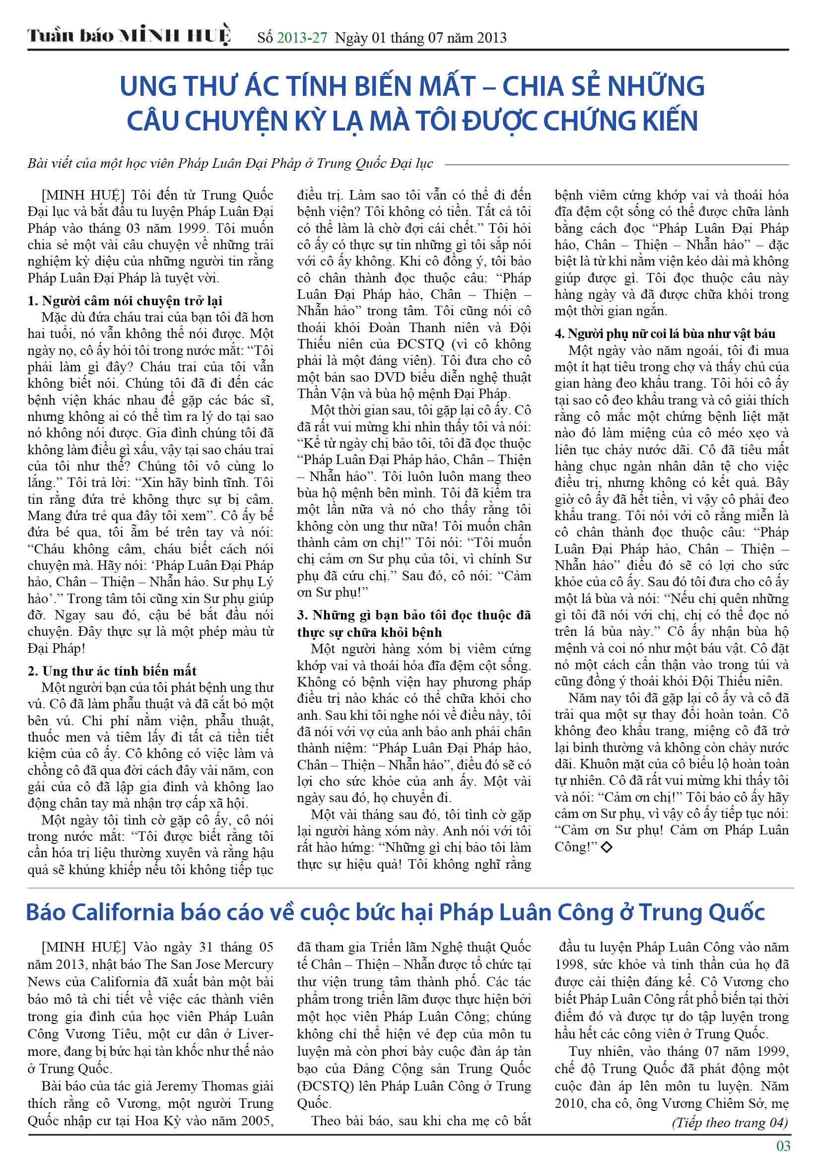 [MINH HUỆ 03-06-2013]Tuần báo Minh Huệ tổng hợp tin tức hàng tuần về cuộc đàn áp ở Trung Quốc và các sự kiện của học viên Pháp Luân Công trên khắp thế giới, với dạng thức là bản in màu định dạng PDF, gồm 4 trang. Bản PDF này định dạng khổ A4 tiện dụng cho việc in ấn phổ thông.