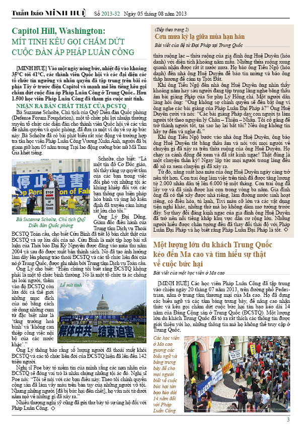 [MINH HUỆ 06-08-2013]Tuần báo Minh Huệ tổng hợp tin tức hàng tuần về cuộc đàn áp ở Trung Quốc và các sự kiện của học viên Pháp Luân Công trên khắp thế giới, với dạng thức là bản in màu định dạng PDF, gồm 4 trang. Bản PDF này định dạng khổ A4 tiện dụng cho việc in ấn phổ thông.