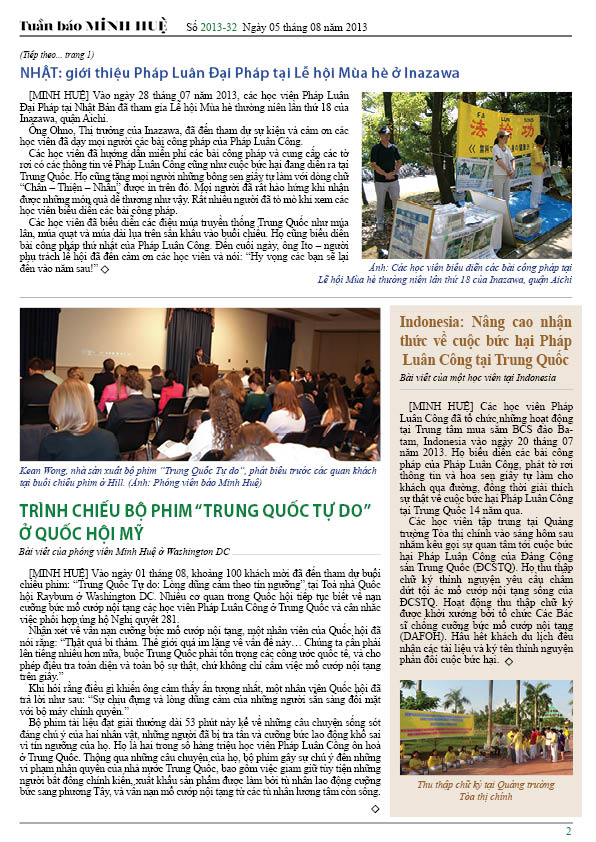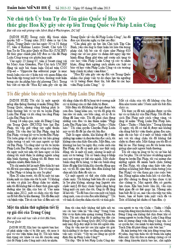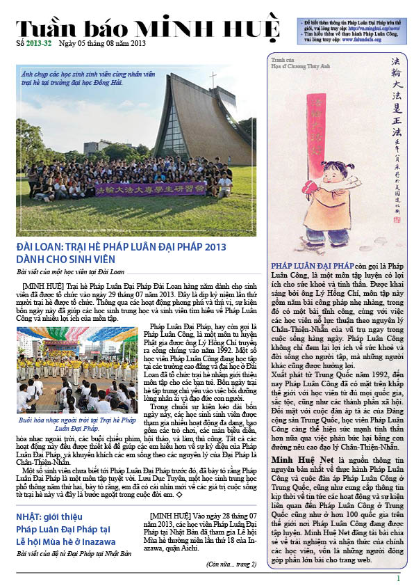 [MINH HUỆ 12-08-2013]Tuần báo Minh Huệ tổng hợp tin tức hàng tuần về cuộc đàn áp ở Trung Quốc và các sự kiện của học viên Pháp Luân Công trên khắp thế giới, với dạng thức là bản in màu định dạng PDF, gồm 4 trang. Bản PDF này định dạng khổ A4 tiện dụng cho việc in ấn phổ thông.