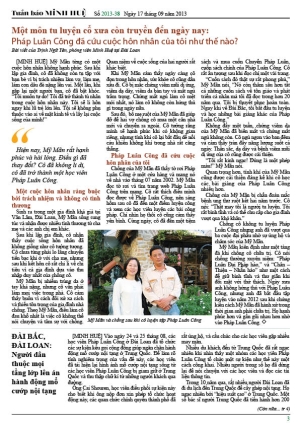 [MINH HUỆ 18-09-2013]Tuần báo Minh Huệ tổng hợp tin tức hàng tuần về cuộc đàn áp ở Trung Quốc và các sự kiện của học viên Pháp Luân Công trên khắp thế giới, với dạng thức là bản in màu định dạng PDF, gồm 4 trang. Bản PDF này định dạng khổ A4 tiện dụng cho việc in ấn phổ thông.