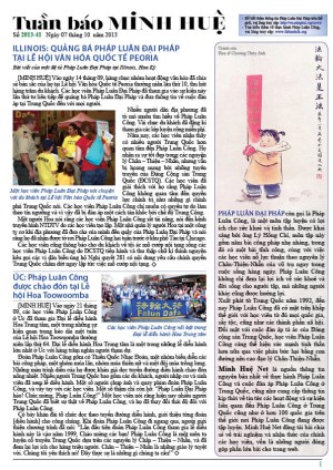 [MINH HUỆ 09-10-2013]Tuần báo Minh Huệ tổng hợp tin tức hàng tuần về cuộc đàn áp ở Trung Quốc và các sự kiện của học viên Pháp Luân Công trên khắp thế giới, với dạng thức là bản in màu định dạng PDF, gồm 4 trang. Bản PDF này định dạng khổ A4 tiện dụng cho việc in ấn phổ thông.