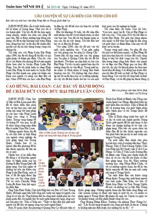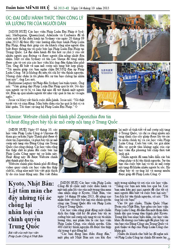 [MINH HUỆ 17-10-2013]Tuần báo Minh Huệ tổng hợp tin tức hàng tuần về cuộc đàn áp ở Trung Quốc và các sự kiện của học viên Pháp Luân Công trên khắp thế giới, với dạng thức là bản in màu định dạng PDF, gồm 4 trang. Bản PDF này định dạng khổ A4 tiện dụng cho việc in ấn phổ thông.