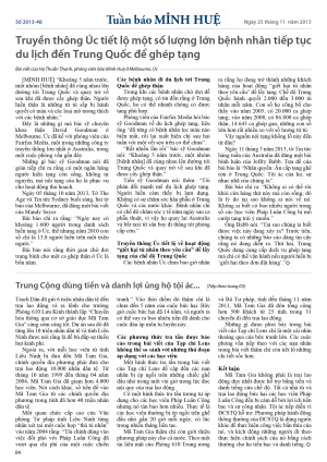 - Truyền thông Úc tiết lộ một số lượng lớn bệnh nhân tiếp tục du lịch đến Trung Quốc để ghép tạng