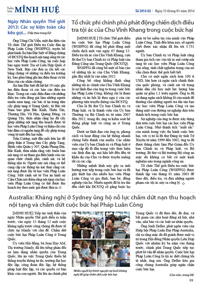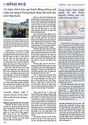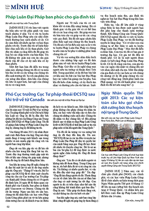 [MINH HUỆ 15-01-2014]Tuần báo Minh Huệ tổng hợp tin tức hàng tuần về cuộc đàn áp ở Trung Quốc và các sự kiện của học viên Pháp Luân Công trên khắp thế giới, với dạng thức là bản in màu định dạng PDF, gồm 4 trang. Bản PDF này định dạng khổ A4 tiện dụng cho việc in ấn phổ thông.
