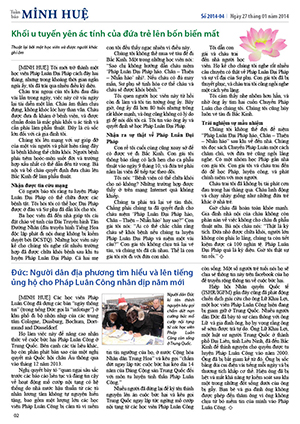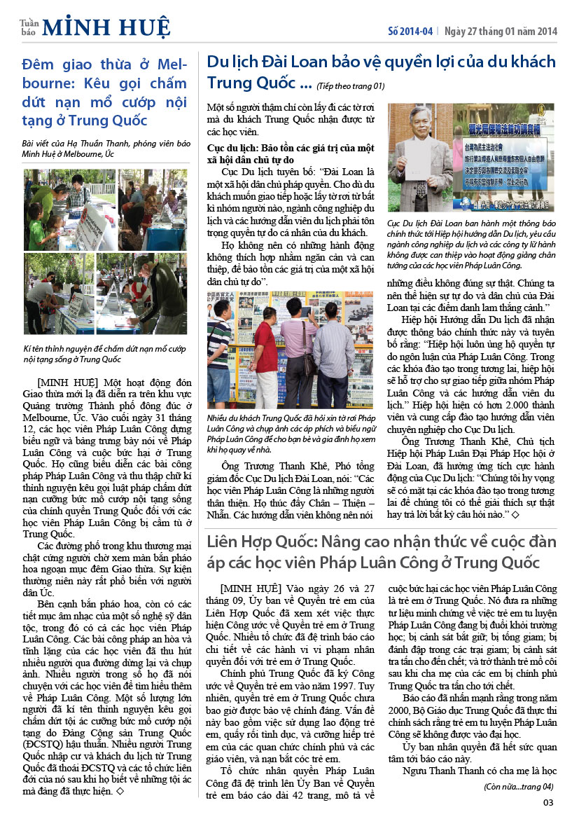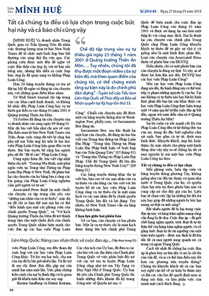 [MINH HUỆ 28-01-2014]Tuần báo Minh Huệ tổng hợp tin tức hàng tuần về cuộc đàn áp ở Trung Quốc và các sự kiện của học viên Pháp Luân Công trên khắp thế giới, với dạng thức là bản in màu định dạng PDF, gồm 4 trang. Bản PDF này định dạng khổ A4 tiện dụng cho việc in ấn phổ thông.